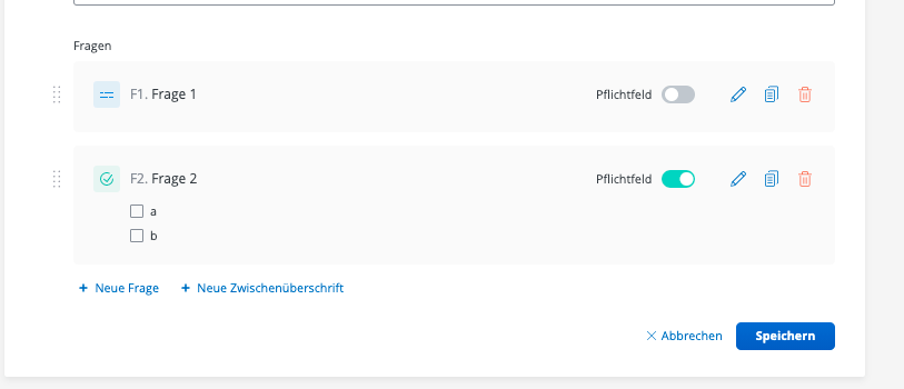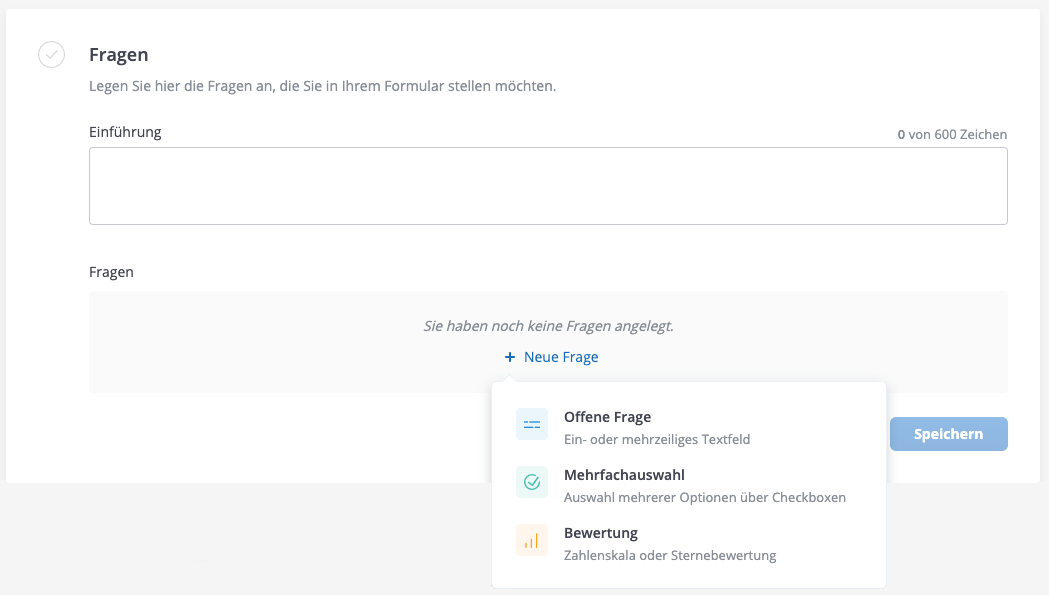 Über "+ Neue Frage" können Sie eine neue Frage anlegen. Wählen Sie dazu aus den drei angebotenen Umfragetypen aus und speichern Sie.