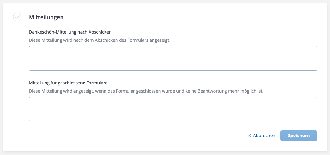 Über "+ Mitteilungen hinzufügen" legen Sie die Mitteilungen, die der Teilnehmenden nach dem Absenden des Formularbogens oder bei dem Aufruf einer abgeschlossenen Umfrage erhalten soll, fest.