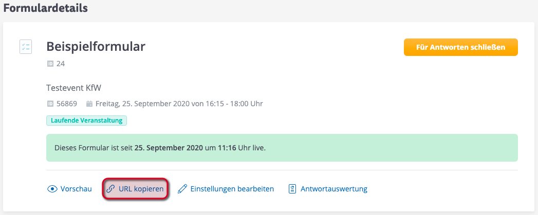 Diesen erhalten Sie nach der Veröffentlichung über die Schaltfläche "URL kopieren". Klicken Sie dazu auf das veröffentlichte Formular und anschließend auf "URL kopieren". Der Link kann in den Kampagnen hinterlegt werden.