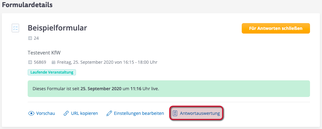 Damit alle angegebenen Daten der Teilnehmenden ausgewertet werden können, muss das Formular abgeschlossen werden. Klicken Sie dazu auf das veröffentlichte Formular und anschließend auf den Button "Für Antworten schließen".