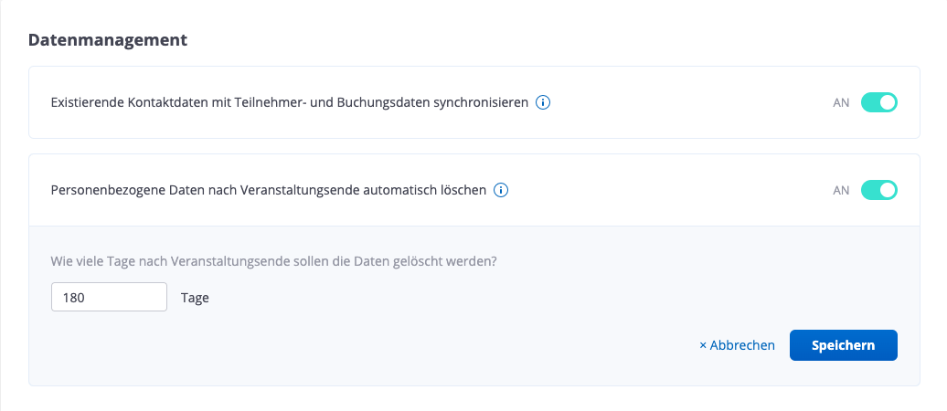 180 Tage nach Veranstaltungsende festgelegt. Das heißt die Buchungs- und Teilnehmerdaten werden 180 Tage nach dem Ende der Veranstaltung automatisch gelöscht und sind