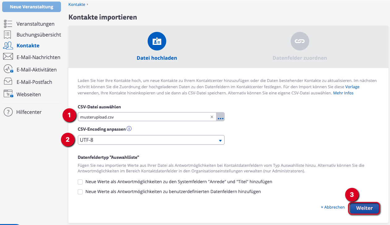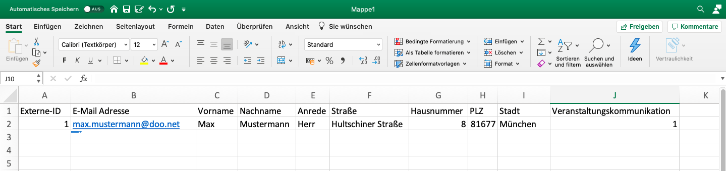 Wichtig! Vor dem Upload muss in der Spalte "Veranstaltungskommunikation" die Zahl "1" zu jedem Datensatz hinzugefügt werden.