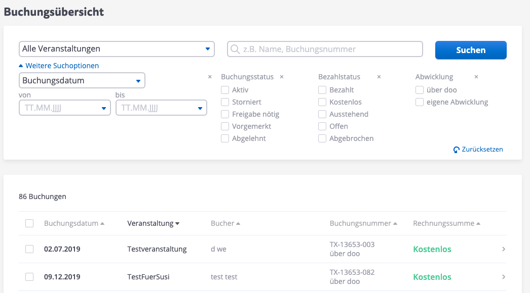 So können Sie zB nach dem Status oder der gebuchten Ticketkategorie suchen bzw. über die "Weiteren Suchoptionen" sogar nach Antworten aus optionalen Abfragefeldern filtern.