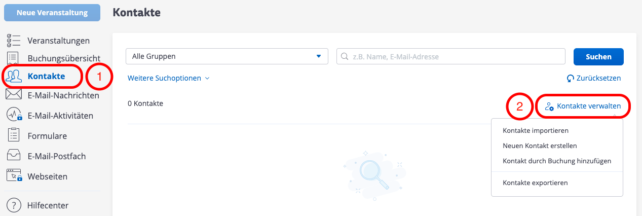 Um Kontakte zu einer Veranstaltung hinzuzufügen, müssen Sie im Menü links das Feld "Kontakte" auswählen. Klicken Sie anschließend rechts auf "Kontakte verwalten".