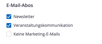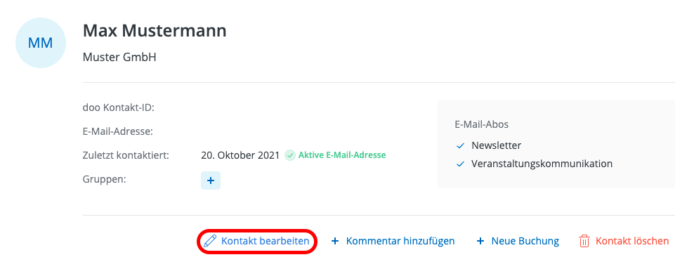 Nun können die Daten des Buchers nach Wunsch angepasst werden. Außerdem kann der Bucher zu Gruppen hinzugefügt werden. Auch ist es möglich die E-Mail Abos des Kontakts per Auswahl der Checkboxen zu ändern. So kann der Kontakt für den Newsletter an- und abgemeldet werden, es kann eingestellt werden, ob die Person Veranstaltungsinformationen erhält oder nicht und es kann definiert werden ob die Person Marketing E-Mails erhalten soll.