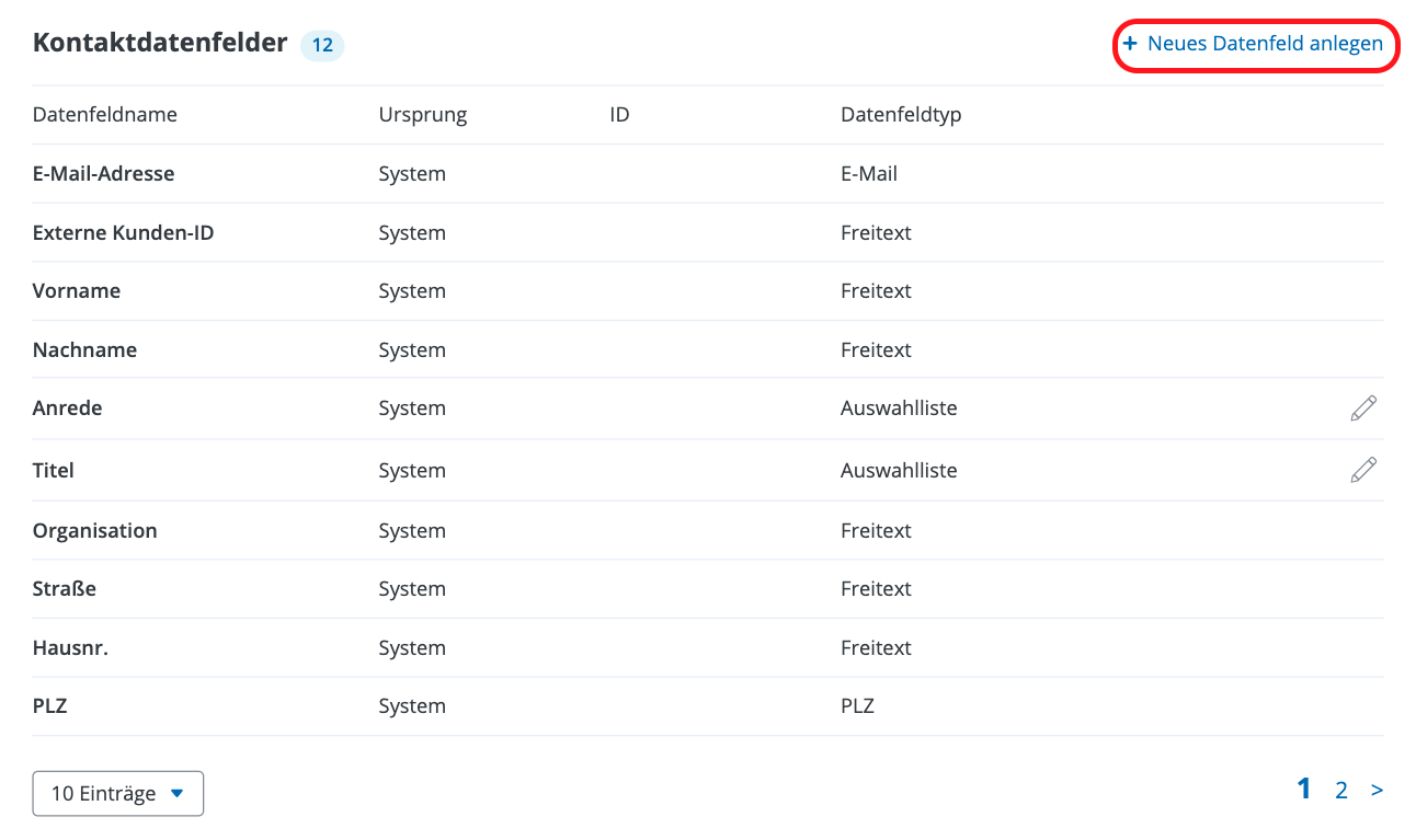 Um ein neues Datenfeld anzulegen, klicken Sie auf "+ Neues Datenfeld anlegen". Anschließend öffnet sich ein Pop-Up in welchem Sie den Namen des Kontaktdatenfeldes angeben und anschließend den Datenfeldtyp festlegen müssen.