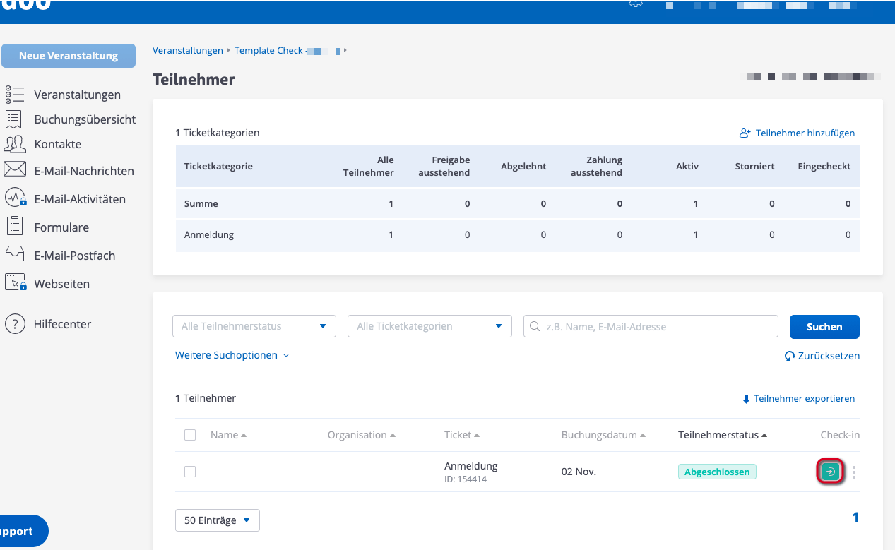 Hier finden Sie eine Übersicht über alle Teilnehmenden Ihrer Veranstaltung. Sie sehen auf den ersten Blick wie viele Teilnehmende sich in welchem Status (aktiv, storniert, eingecheckt) befinden und können über die Filter unten noch gezielter nach bestimmten Teilnehmenden suchen.