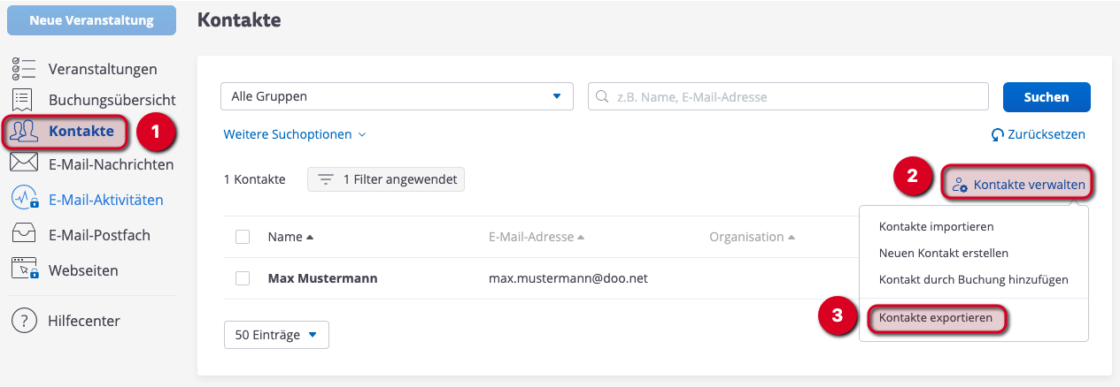 Tipp! Sie können auch einzelne Gruppen exportieren und den integrierten Filter nutzen. Bei dem Export werden alle Datenfelder und Kontaktinformationen, wie Gruppenzugehörigkeiten oder Newsletteranmeldungen exportiert.