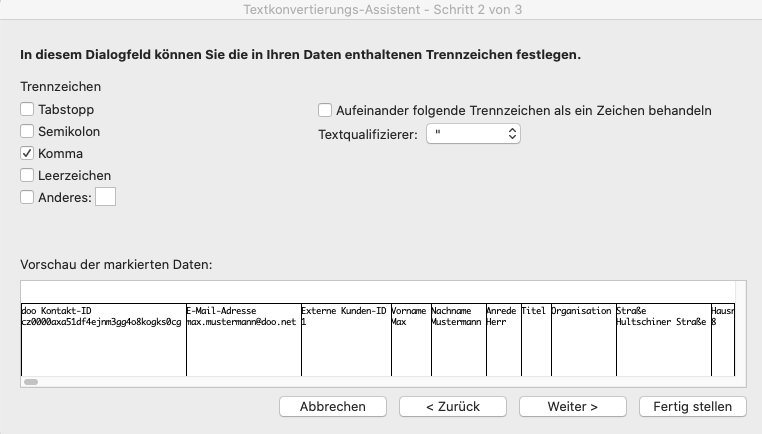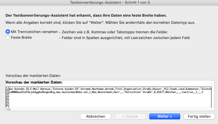 - Anleitung für MacOS: “Datei” > “Importieren” > “CSV Datei” > "entsprechende Datei im Finder auswählen"
