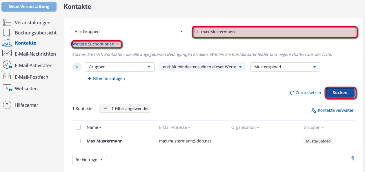 Sollten Sie einen Kontakt bearbeiten wollen, so können Sie diesen über die integrierte Such- und Filterfunktion finden. Geben Sie dazu einfach bekannte Kontaktdetails in das Suchfeld ein und bestätigen Sie die Eingabe mit einem Klick auf "Suchen". Um die Suche zu verfeinern können Sie über "Weitere Suchfunktionen" zusätzliche Suchkriterien hinzufügen.