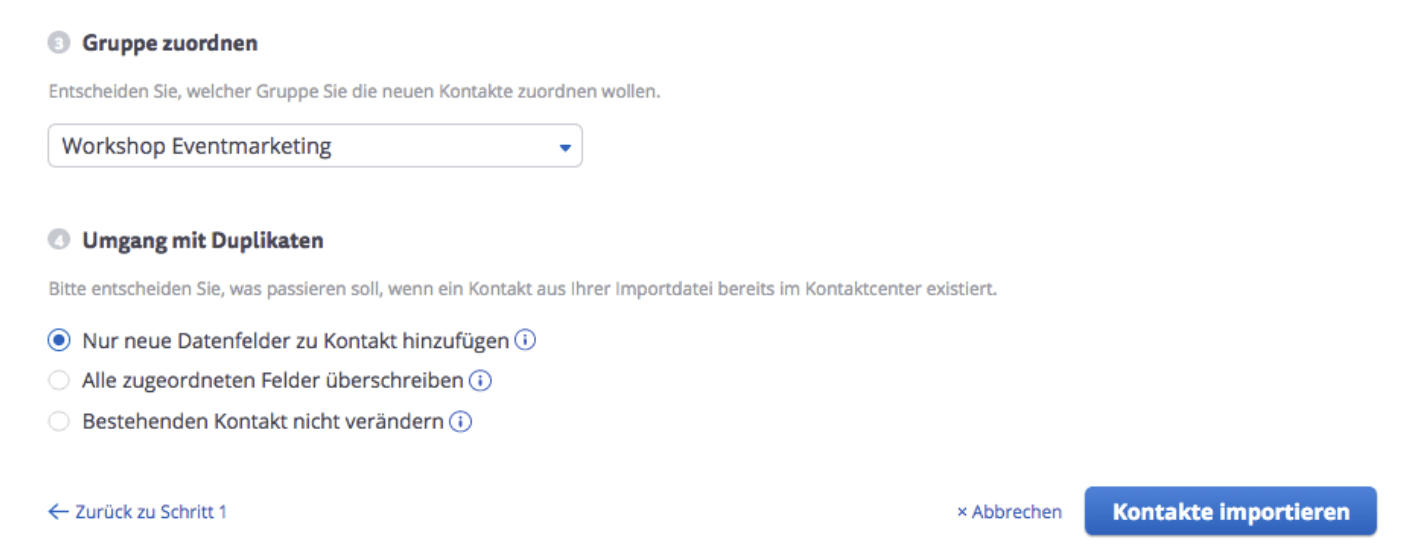 Abschließend muss der Umgang mit Duplikaten geregelt werden. Hier haben Sie die Möglichkeit zwischen drei Optionen auszuwählen. Option 1 ordnet nur neue Datenfelder den Kontakten zu. Ist ein Datenfeld bereits ausgefüllt wird dieses nicht abgeändert. In der zweiten Option werden alle Felder mit den neuen Werten überschrieben. In der dritten Option werden nur neue Kontakte übernommen, bestehende Kontakte jedoch nicht verändert. Über den Button "Kontakte importieren" bestätigen Sie Ihre Angaben. Eine Zusammenfassung des Uploads erhalten Sie an Ihre E-Mail.