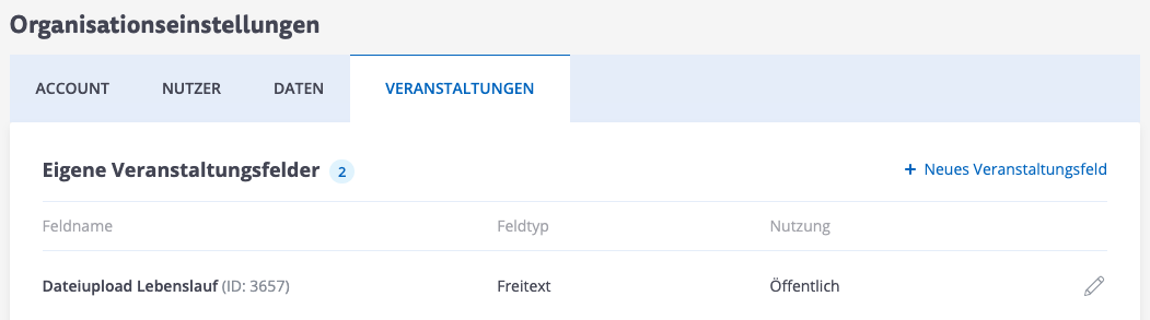 Außerdem haben Sie die Möglichkeit unter Einstellungen das Feld bei neuen Veranstaltungen standardmäßig hinzufügen oder dieses als internes Feld zu kennzeichnen, sodass dieses nicht im Buchungsprozess anzeigt wird.