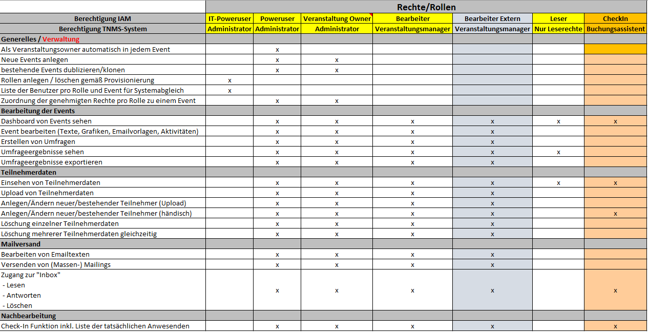 Die entsprechenden Berechtigungen je Rechte/Rollen entnehmen Sie bitte der folgenden Tabelle.